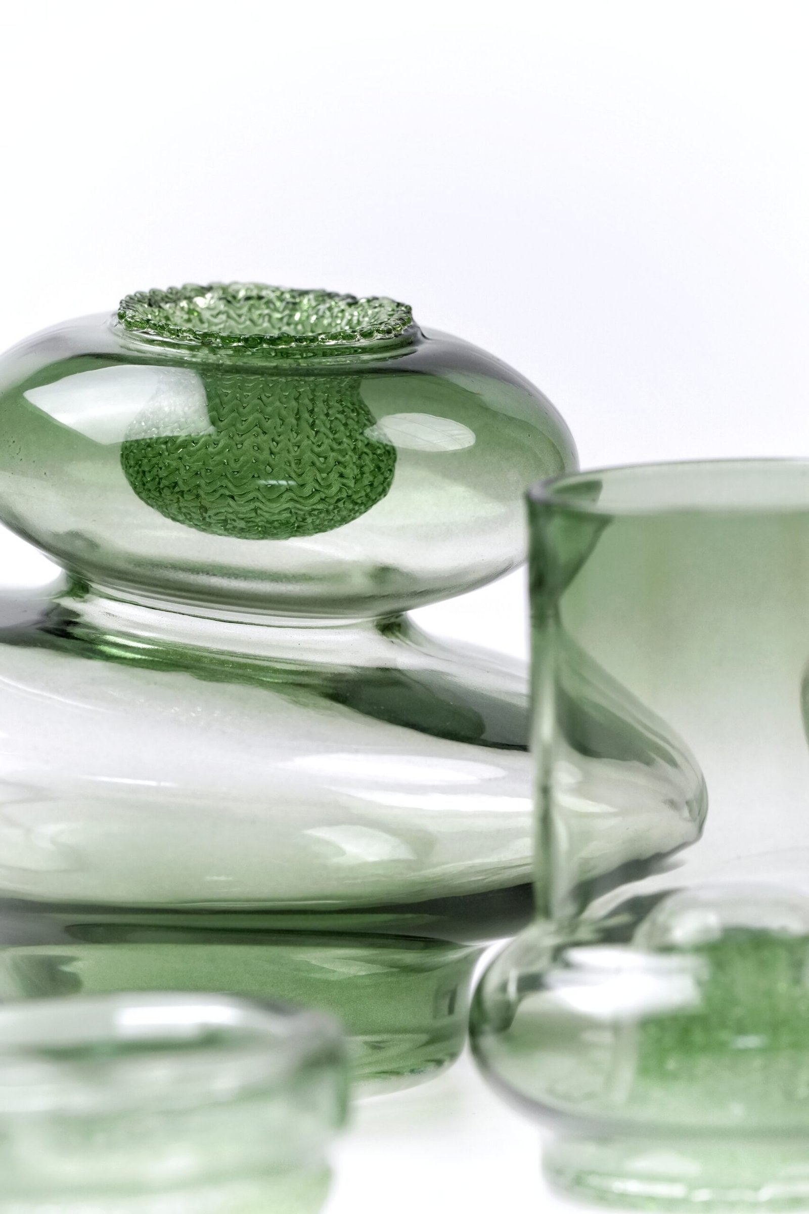 This is a design project centered around the innovation of glass flameworking techniques. We’ve developed a unique approach where glass is manipulated like knitted wool, allowing us to create objects with distinct tactile charm. These hand-crafted pieces retain the transparency and durability of borosilicate glass while boasting a fabric-like texture.